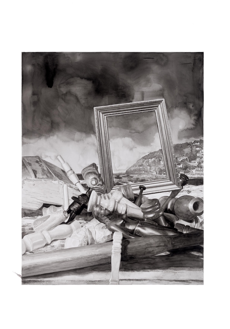 | Undertow IV Wished up (next stop Peru) 2025 Lamp black and coloured pencil on Fabriano paper, 700 x 960mm |